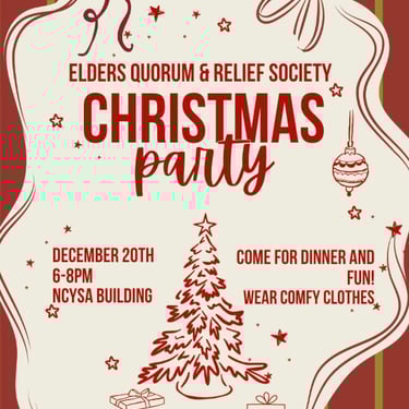 Saturday, December 20th: FHE - Elders Quorum and Relief Society Christmas Party. Come for Dinner and Fun! Wear comfy clothes.